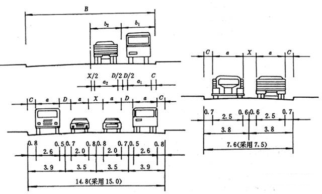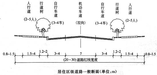 1).居民區(qū)級道路:道路紅線之間的道路各項(xiàng)用地寬總和。