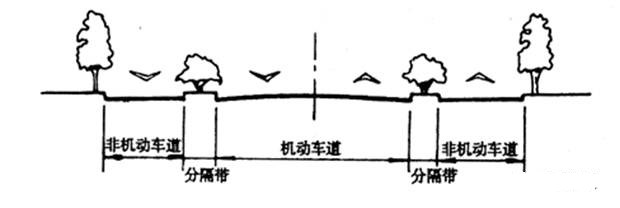 適用于機(jī)動車交通量大、車速要求高、非機(jī)動車多且道路路幅較寬的大型場地交通干道,如居住區(qū)主要道路等。