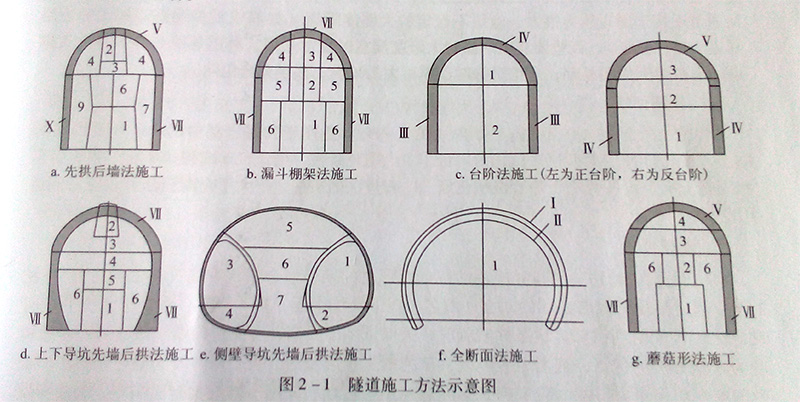 又有正臺階法和反臺階法之分(圖2 -lc)。①正臺階法系在穩定性較差的巖層中施時,將整個坑道斷面分為幾層,由上向下分部進行開挖,每層開挖面的前后距離較小而成幾個正臺階。上部臺階的鉆眼作業和下部臺階的出碴,可以平行進行而使工效提高。斷面完全開挖后,再由邊墻到頂拱筑襯砌。在坑道頂部最先開挖的第一層為一弧形導坑,需要鉆較多的炮眼,導坑超前距離很短,可使爆破時石碴直接拋落到導坑之外,以減少扒碴工作量,從而提高掘進速度。如坑道頂部巖層松動,應立即在導坑內用錨桿或鋼拱架作臨時支護,以防坍塌。②反臺階法則用于穩定性較好的巖層中施工,也將整個坑道斷面分為幾層,在坑道底層先開挖寬大的下導坑,再由下向上分部擴大開挖。進行上層的鉆眼時,須設立工作平臺或采用漏斗棚架,后者可供裝碴之用。