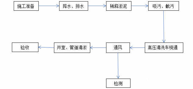 使用泥漿泵將檢查井內(nèi)污水排出至井底淤泥。將需要疏通的管線進行分段,分段的辦法。根據(jù)管徑與長度分配,相同管徑兩檢查井之間為一段。