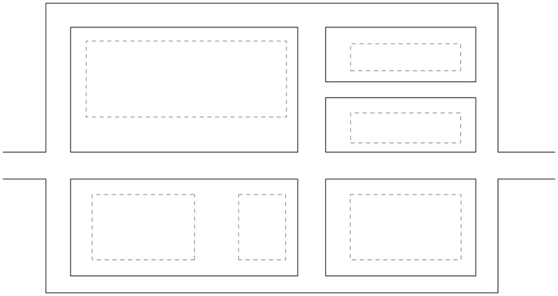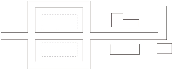 道路主要平行于主要建筑、構筑物,圍繞各庫房進行布置,這種道路布置形式受地形條件限制,一般不宜在山區丘陵地區采用,且道路的總長度及占地較多,對于交通繁忙、車流和人流組織需要分離的采用,如圖所示。
