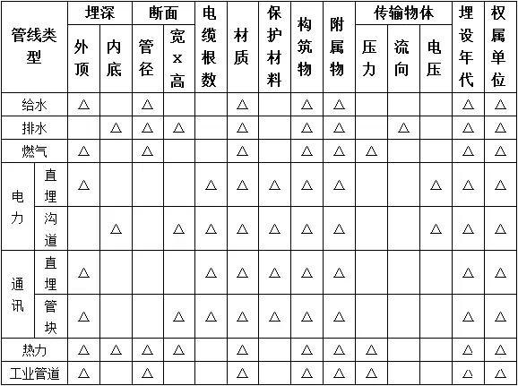 地下管線調查應在地下管線現況調繪圖所標示各類地下管線位置的基礎上,通過對所出露的地下管線及附屬設施按下表的調查項目要求詳細核查地下管線及其附屬物的各屬性,做好記錄和量測。
