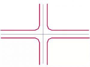 主要公路與次要公路的T形交叉,當轉彎交通量較大而會導致直行車輛的過分減速時,應采用加寬式T形交叉左轉彎交通量較大者,可采用該型式。