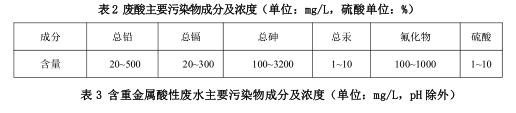 含重金屬酸性廢水主要產(chǎn)生于制酸凈化工段電除霧沖洗、沖渣、濕法收塵、濕法車(chē)間、地面沖洗、實(shí)驗(yàn)室、有害渣庫(kù)滲濾等,主要污染物有重金屬離子、酸、懸浮物等。