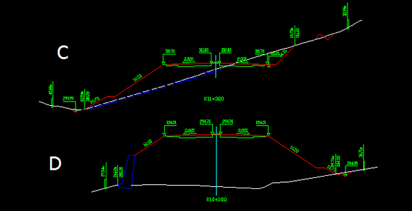 C截面值得注意的是左邊原地面線比較陡,怕邊坡日后滑動,失穩等,把原地面線挖成臺階再填土做路基。右邊避免山上的雨水直接流入道路,設置了截水溝,又叫天溝。