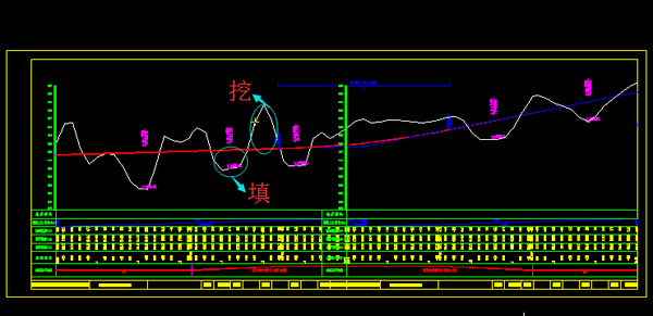 白線是路線中線的高程起伏情況,那么我們一定是想填土和挖土都少一點吧?于是我們考慮縱斷面的填挖平衡且盡量就近平衡。看圖中填挖基本平衡,就近也基本平衡。這里紅線就是我們定下的路線高度位置。圖下面是各種高度數據,填挖土高度數據。平面和縱面要協調設計,有時候發現縱斷面圖形太奇葩,那么平面設計要調整。平縱組合也有原則。后面的橫斷面設計也是會發現前面工作要改的。