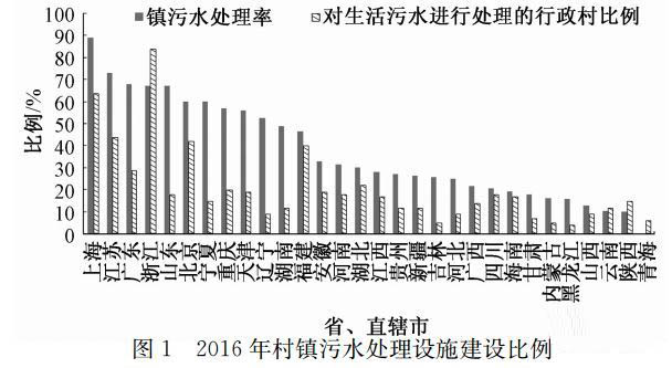 村鎮(zhèn)污水處理在我國(guó)剛剛起步,污水處理設(shè)施建設(shè)落后于經(jīng)濟(jì)發(fā)展的速度。截至2016年底,全國(guó)對(duì)生活污水進(jìn)行處理的建制鎮(zhèn)比例為52.64%,也就是說(shuō)全國(guó)有18 099個(gè)建制鎮(zhèn),其中13 028個(gè)沒有污水處理設(shè)施,同時(shí)已建成的污水處理設(shè)施不到一半尚可正常運(yùn)行;對(duì)生活污水進(jìn)行處理的行政村占20%。仍有大量地區(qū)的農(nóng)村污水處理設(shè)施處于空白。圖1表明各省市行政村污水處理設(shè)施建設(shè)情況,地區(qū)差異較為明顯。上海、江蘇、浙江、山東等省市建制鎮(zhèn)污水處理率較高的地區(qū)可達(dá)到89.18%,行政村比例達(dá)到64%、44%、84%和18%,西北、東北地區(qū)僅為0.01%~25.7%。考慮到農(nóng)村污水治理建設(shè)費(fèi)用巨大、農(nóng)村管理能力不足等因素,參照國(guó)外發(fā)達(dá)國(guó)家治理歷程,全面實(shí)現(xiàn)農(nóng)村污水治理還需較長(zhǎng)時(shí)間努力。當(dāng)前,在大幅度提高建制鎮(zhèn)污水處理率基礎(chǔ)上,重點(diǎn)推動(dòng)經(jīng)濟(jì)發(fā)達(dá)地區(qū)、生態(tài)環(huán)境敏感、人口密集等地區(qū)農(nóng)村污水治理,梯次推進(jìn)農(nóng)村生活污水治理。