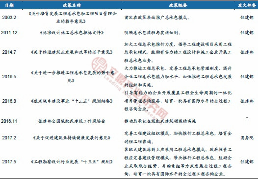 ——自2003年開(kāi)始,國(guó)家陸續(xù)出臺(tái)政策推廣總承包模式,并引導(dǎo)裝配式建筑原則上使用總承包模式。2016年住建部發(fā)布《關(guān)于進(jìn)一步推進(jìn)工程總承包發(fā)展的若干意見(jiàn)》,《意見(jiàn)》強(qiáng)調(diào)大力推進(jìn)工程總承包,提升項(xiàng)目可行性研究和初步設(shè)計(jì)深度,實(shí)現(xiàn)設(shè)計(jì)、采購(gòu)、施工等各階段工作的深度融合,提高工程建設(shè)水平。