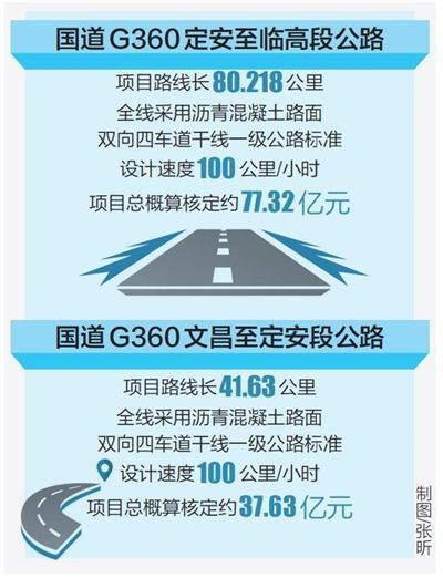 2019年8月,省發(fā)展改革委批復了國道G360定安至臨高段公路初步設計和概算。項目路線長80.218公里,全線采用瀝青混凝土路面,雙向四車道干線一級公路標準,設計速度100公里/小時。項目總概算核定約77.32億元。