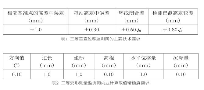 沉降觀測點設(shè)置于橫梁的頂面或塔柱的側(cè)面(共兩個)。沉降測量采用精密水準儀幾何水準法和三角高程對向觀測法。按《工程測量規(guī)范》(GB 50026-2007)三等垂直位移變形測量進行施測,三等垂直位移監(jiān)測網(wǎng)的主要技術(shù)要求見表1。三等變形測量監(jiān)測網(wǎng)內(nèi)業(yè)計算取值精確度要求見表2。