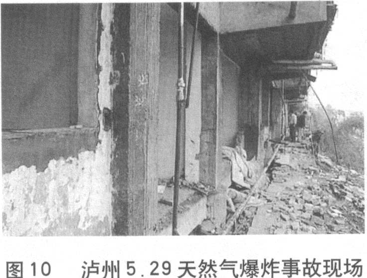 1.2006年8月30日上午,重慶市南岸區(qū)在進行道路改造施工時,挖掘機不慎將天然氣主管道挖破,導致天然氣猛烈外噴,氣柱高達近十米。事故發(fā)生后,上千戶居民被緊急疏散,未造成人員傷亡,當?shù)鼐用竦娜粘I钍艿酵庥绊憽?br /> 2、2004年5月29日19時45分,瀘州市納溪區(qū)炳靈路15號居民樓人行道下,突然發(fā)生劇烈的天然氣爆炸事故,造成5人死亡,35人不同程度受傷,附近一樓10余居民的家園被毀,臨街一樓12間門面受損,近50米長范圍內(nèi)的街道被震得一片狼藉。事故的原因是:管道局部的防腐層受到外力破壞,導致腐蝕穿孔,該位置正好位于民樓附一層與道路堡坎形成的窄縫中,地勢較低,聚集大量天然氣,因氣候變化因素發(fā)生膨脹而釋放至窄縫外,與空氣形成爆炸性氣體,遇人行道上不明火源而引發(fā)爆炸。