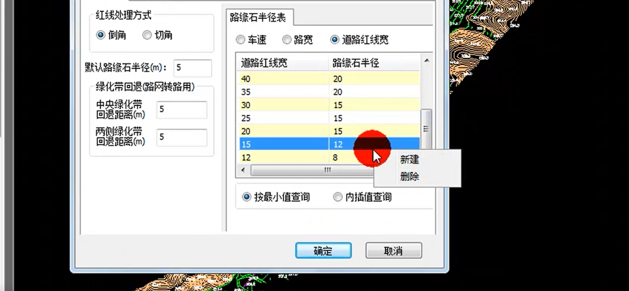 3)道路紅線寬是指針對不同的道路紅線寬對于不同的路緣石半徑,我們可以進行“新建”、“刪除”。