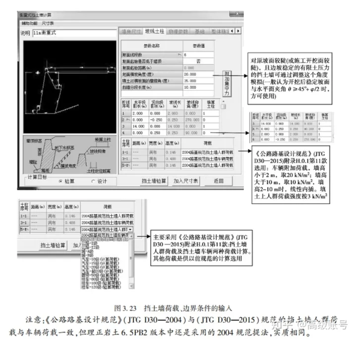 在實際設計工作中也常用理正軟件來進行設計或驗算。理正擋墻中內置了多種計算車輛荷載的方法,其中采用“2004路基規(guī)范擋土墻車輛車載”這一選擇,即是跟現(xiàn)行規(guī)范的規(guī)定一致,換算土柱高度是根據(jù)我們輸入的墻高和填土容重自動計算的。所以個人認為直接選這一項就可以了。