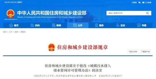 住房和城鄉(xiāng)建設部發(fā)布《關于修改<城鎮(zhèn)污水排入排水管網(wǎng)許可管理辦法>的決定》,對《城鎮(zhèn)污水排入排水管網(wǎng)許可管理辦法》(住房和城鄉(xiāng)建設部令第21號)作出修改,進一步對排水戶分級分類管理、優(yōu)化審批服務、監(jiān)督管理及法律責任作了明確規(guī)定,將于2023年2月1日起施行。以下為“決定”全文以及“管理辦法”全文。