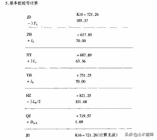 1)在JD處沿兩切線方向分別量取103.37m得平曲線起點(diǎn)(ZH)終點(diǎn)(HZ)的位置;