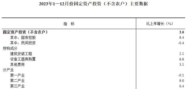 2023年,全國固定資產投資(不含農戶)503036億元,比上年增長3.0%(按可比口徑計算),增速比1—11月份加快0.1個百分點。其中,制造業投資增長6.5%,增速加快0.2個百分點;基礎設施投資(不含電力、熱力、燃氣及水生產和供應業)增長5.9%,增速加快0.1個百分點。從環比看,12月份固定資產投資(不含農戶)增長0.09%。2023年,民間固定資產投資253544億元,比上年下降0.4%,降幅比1—11月份收窄0.1個百分點。