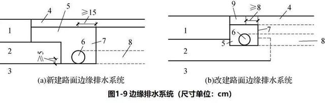 1)路面邊緣排水系統由縱向排水管、橫向出水管、集水溝和反濾織物(土工布)等組成,如圖1-9所示。