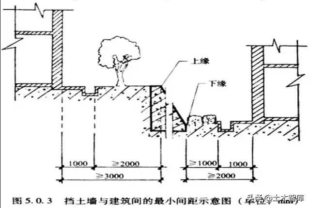 1、 居住區(qū)內(nèi)的擋土墻與住宅建筑的間距應(yīng)滿足住宅日照和通風(fēng)的要求; 2 、高度大于2m的擋土墻和護(hù)坡的上緣與建筑間水平距離不應(yīng)小于3m,其下緣與建筑間的水平距離不應(yīng)小于2m。
