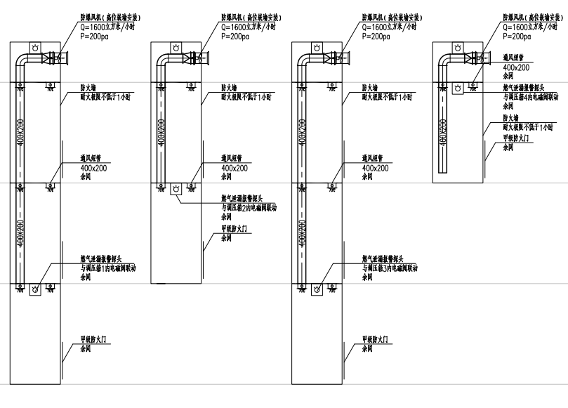 2. 管井內(nèi)樓層高度處作通風(fēng)安全隔柵或多孔水泥板(可站人),檢修門采用甲級防火門(600x1800);墻體采用防火墻,燃?xì)夤芫疄橐粋€(gè)獨(dú)立的防火分區(qū),燃?xì)夤芫恍∮?平方米,可進(jìn)人維修。