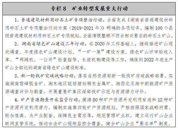 支持省屬國有礦企整合我省優勢礦產資源,引導省內頭部礦企通過強強聯合、兼并重組、境外并購和投資合作等方式,收購或控股一批勘查、開采、選冶加工企業,促進規模化、集約化經營。針對不同的優勢礦種,實施不同的產業發展政策,培育一批我省優勢礦種的特色礦企。建立優勢礦產交易平臺,提高全省礦業企業行業地位,實現從產品優勢到市場優勢的轉型,提高湖南優勢礦產話語權。