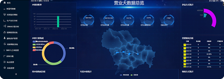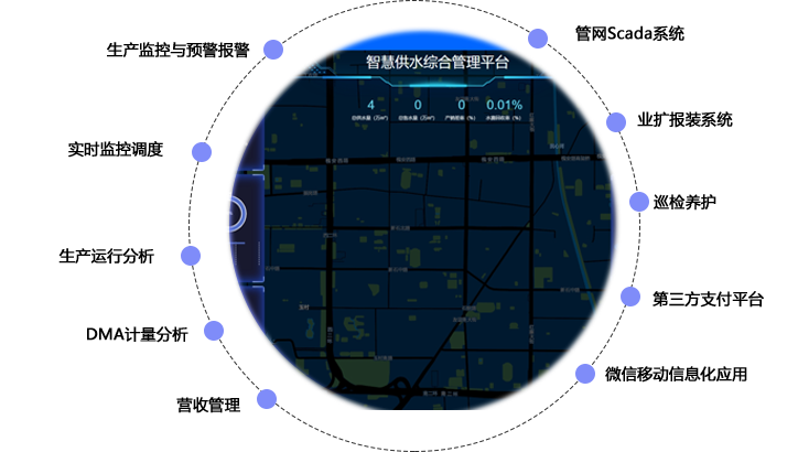 包括原水監控管理系統、水廠監控系統、管網Scada系統、漏損綜合管控系統、巡檢維修工單系統和營業收費系統。